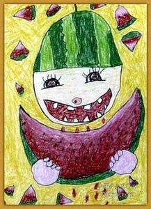 接下来,让我们来笑一笑,看看这些“搞笑达人”的吃瓜画作。在这些作品中,孩子们用夸张的表情和动作,描绘出了一个个搞笑的吃瓜场景。比如,一个小朋友拿着西瓜,一边吃一边哈哈大笑,脸上还流着口水;还有一个小女孩,坐在西瓜旁边,突然被西瓜汁溅了一脸,她用手捂着眼睛,表情夸张地表示惊讶。